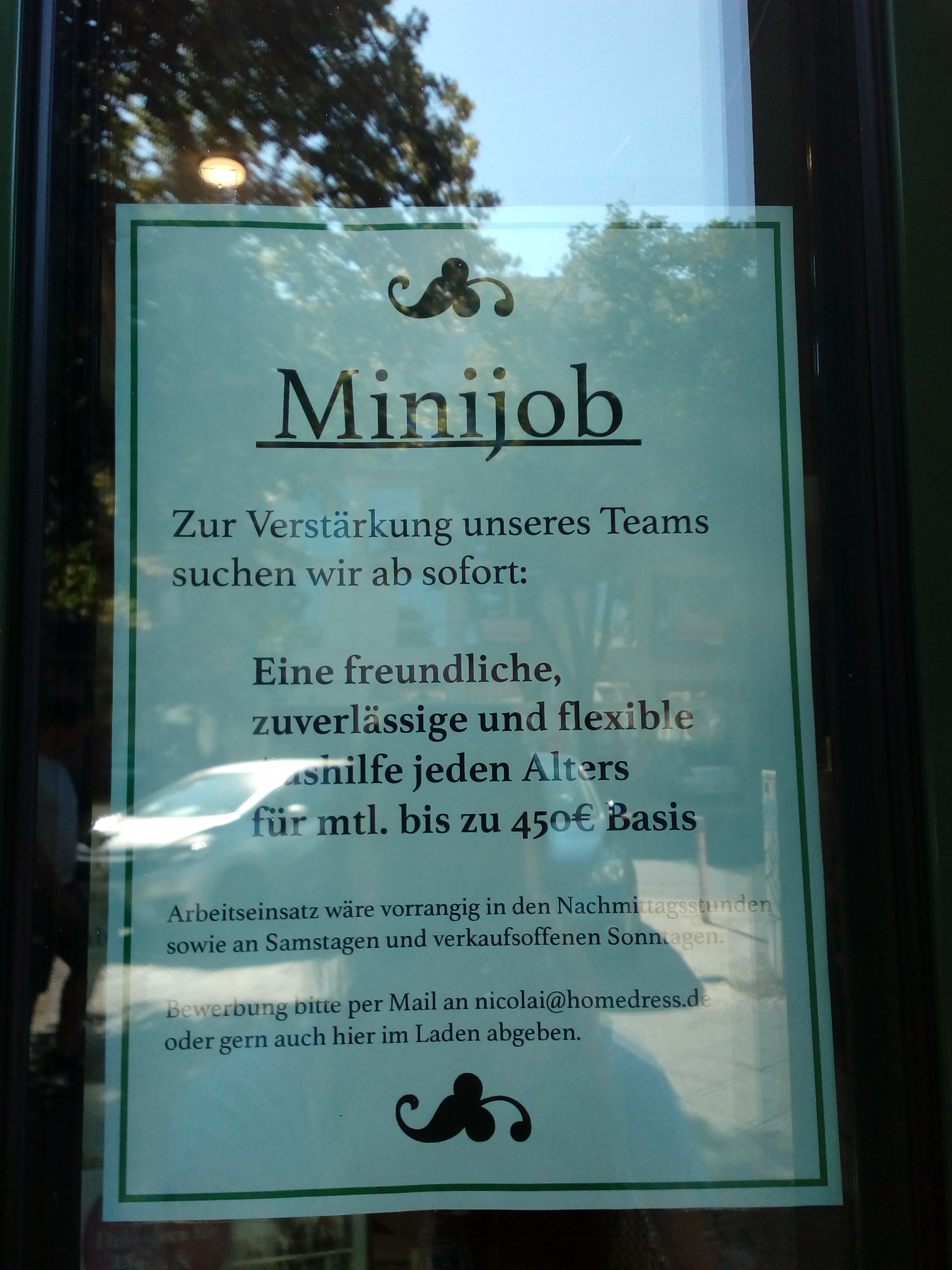 Homedress an der Ecke Lindenallee sucht eine, gern auch ältere, Mitarbeiterin auf 450,00-Basis als Aushilfe. Der Umzug weg vom Standort Ecke Müggelseedamm scheint sich gelohnt zu haben.