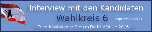 Der Friedrichshagener Schirm befragte die Kandidaten im Wahlkreis 6 Treptow/Köpenick für die Wahl zum Abgeordnetenhaus von Berlin 2016.