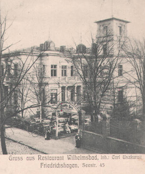 Ackerland erstreckte sich 1870 beiderseits des kleinteilig bebauten Anwesens, das die westliche Hälfte des heutigen Seebades einnahm. Im Zuge des urbanen Wandels und des Aufstiegs Friedrichshagens zum offiziellen Seebad wurde das Seeufer jedoch rasch besiedelt. Auf besagtem Grundstück entstand um 1888 eine stattliche Villa, in der sich eine Gaststätte mit Gartenrestauration, das „Wilhelmsbad“, etablierte. Bereits 1896 Gründungsstätte des Schwimmklubs „Wildente“, war es später auch Festlokal des Schwimmklubs „Müggelsee 1900“. Das „Wilhelmsbad“ entwickelte sich zu einem populären Vergnügungsort, der im separaten Saalbau zudem Raum für Theateraufführungen und Großveranstaltungen bot.