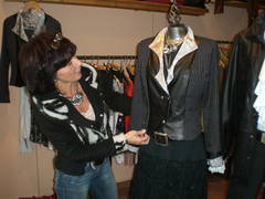 Das Geschäft wird gemeinsam betrieben von der Diplom – Designerin Barbara Lindner – Köpcke und ihrem Ehemann Rolf. Heute ist Zeit für einen freundlichen Empfang, eine kompetente Beratung. Auch in Muße umsehen kann man sich in dem stilvoll gestalteten Raum. Hier wird nicht einfach Ware an die Käuferin – die Mehrzahl der Kunden sind, vermute ich , Frauen – gebracht; hier ist liebevoll Interieur , eigenhändig und kreativ entworfene und gestaltete Mode und Mobiliar in Symbiose gebracht.