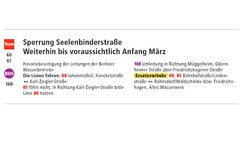 Der Tramverkehr in der Seelenbinderstraße in Köpenick soll nach Auskunft der BVG am 7. März wieder aufgenommen werden. Ein Rohrbruch hatte dort im vergangenen Jahr - am 29. August - die Berliner Wasserbetriebe auf den Plan gerufen. Die Verbindung der Tram Linien 60 und 61 wurden unterbrochen.